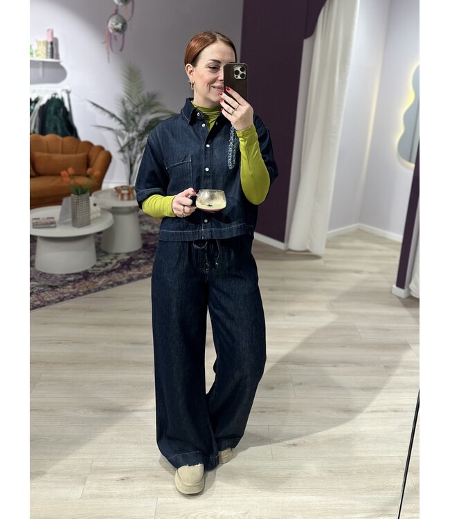 De ZOLA denim jogger in deep blue combineert comfort en stijl met een elastische taille en wide fit. Gemaakt van soepel stretch-denim: ideaal voor een all-day outfit met T-shirt of combineer het met de MAAN blouse. Het item valt ruim.