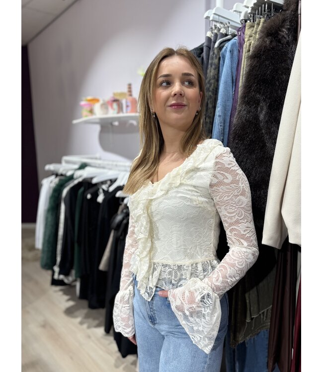 De JADEN lace longsleeve in off white is een verfijnde essential met een romantische uitstraling. Het delicate kant geeft een vrouwelijke touch, terwijl de zachte kleur moeiteloos combineert met iedere outfit.