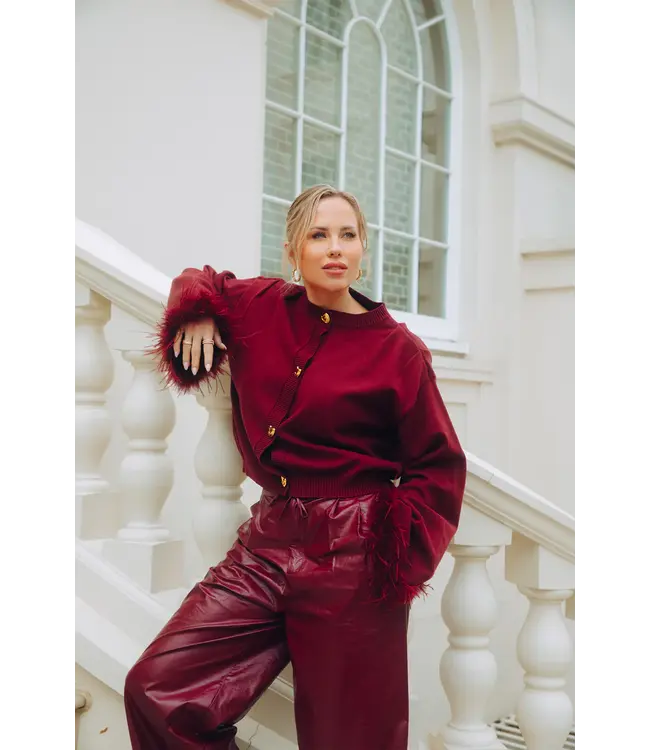 De MADY cardigan in bordeaux voelt heerlijk zacht aan en geeft elke outfit een warme, stijlvolle touch. Ideaal voor zowel thuis als kantoor. De veertjes aan de mouw zijn afneembaar. Het item valt op maat