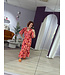 Rode jurk met roze bloemen is perfect voor avondjes uit of een statement overdag. Het item valt op maat.